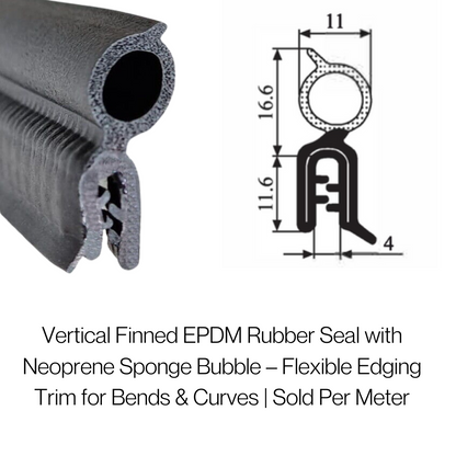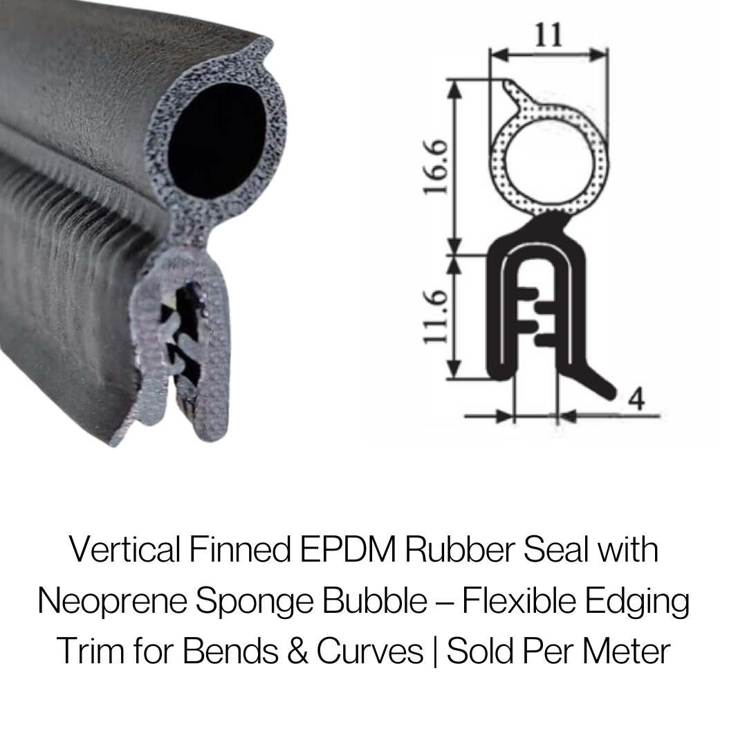The Seal Extrusion Company presents the EPDM Rubber Vertical Finned Seal with Neoprene Sponge Top, ideal for bends, curves, and edge sealing applications. This high-quality rubber trim is designed for panels with a thickness of 1mm to 2.5mm and features a flexible steel core for added durability.